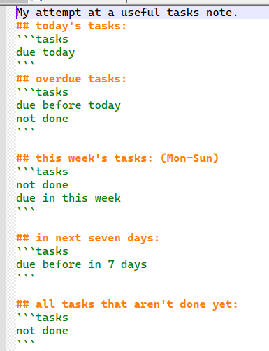 To actually view the tasks, I have a “task note” with a number of task queries on it. For now, it looks like this: